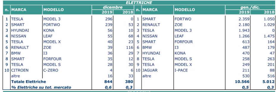 Electric car’s sales are surging in Italy with over 10.000 deliveries in 2019 (5.012 in 2018). But the market-share remains only 0,5%, with exactly 10.556 EV sold on a total of 1,916 millions. Best-seller car is Smart EQ ForTwo, with 2.359 deliveries, slightly more than Renault Zoe (2.180). Third ranking for Tesla Model 3, with 1.943 deliveries.