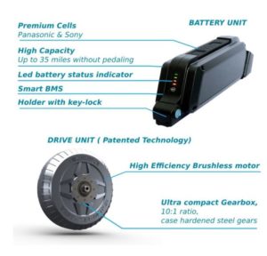 - Pushme è un kit motore firmato da Geoge Kalligeros, ex ingegnere di Tesla, in collaborazione con Dan Keene, uno dei fondatori di Deliveroo. Il kit comprende una ruota con la possibilità di scelta di formato: da 26″, 27,5″ oppure 28’’. Un motore Bafang da 250W al mozzo, che si può scegliere per trasmissione single speed oppure a 8 o 9 velocità. Freni v-brake o a disco, per un peso totale di 3 kg. A questo va aggiunta la batteria estraibile agli ioni di litio da 210Wh, 36V (dal peso di 1,2 kg), che viene posizionata sul tubo orizzontale in una scocca di alluminio (peso 0,5 kg), con sensore di cadenza e blocco batteria. Per un totale di circa 4,7 kg finale. Costa circa 400 euro.