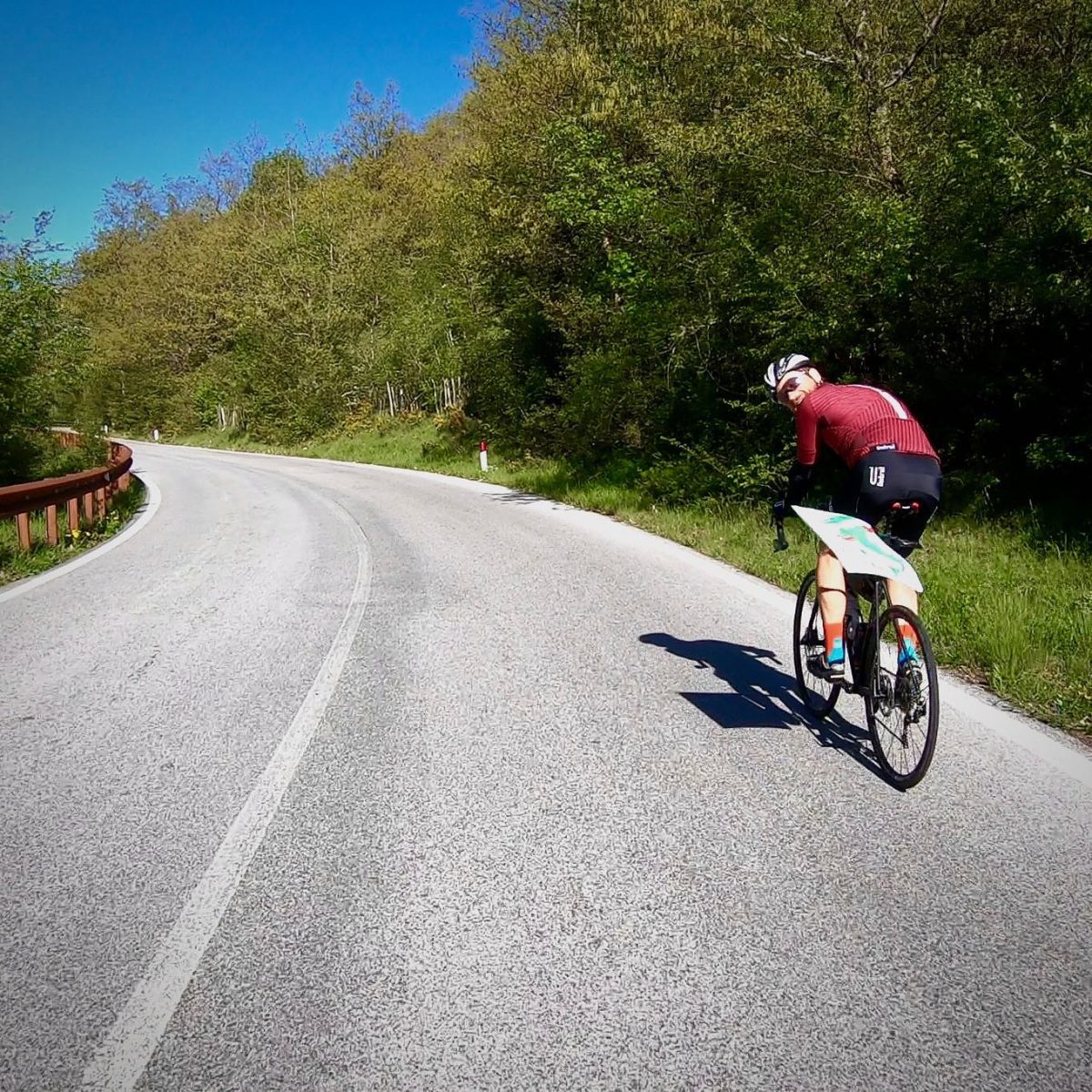 Durante quest’ultimo tratto di percorso, Diluviani ha avuto anche un piccolo incidente (per fortuna senza conseguenze gravi), dopo un “incontro ravvicinato” con un pirata della strada. I pericoli del mestiere…