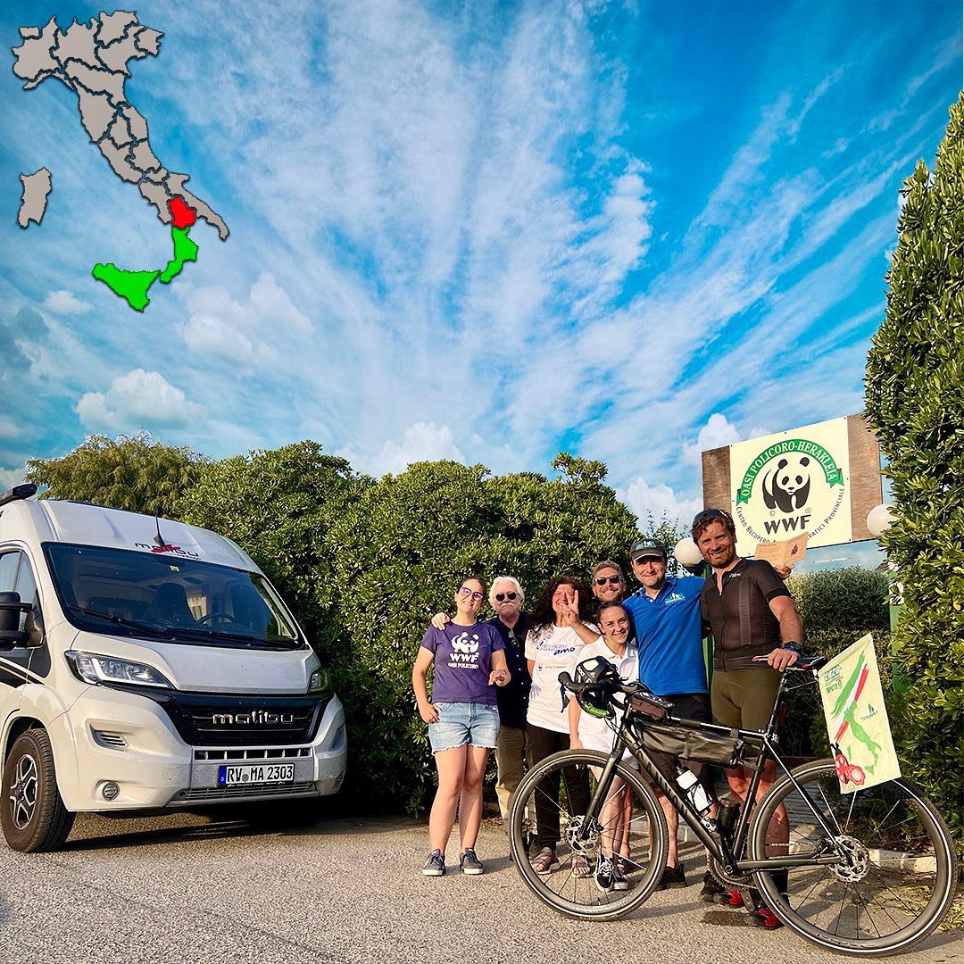 Perseguendo l’obiettivo di “una regione al giorno”, il tour è partito lo scorso 18 giugno dalla Sicilia, da Belpasso, alle pendici dell’Etna. Magliozzi e Diluviani sono sbarcati in breve tempo in Calabria (stop ad Amantea), costeggiando il bel mare cristallino in direzione Basilicata. Qui hanno soggiornato nell’Oasi Bosco Pantano di Policoro, area protetta dal WWF, partner storico del tour.