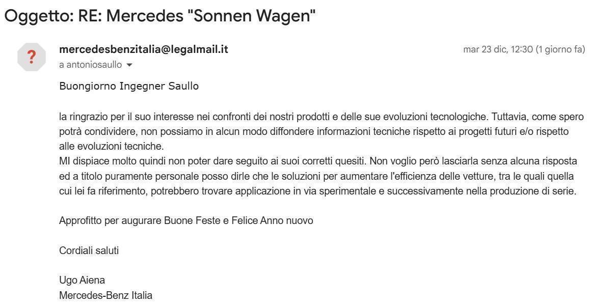 Risposta- Sulla vernice fotovoltaica confermiamo che nulla di nuovo si è saputo in più di quello che Mercedes disse un anno fa e le ha ribadito rispondendole.