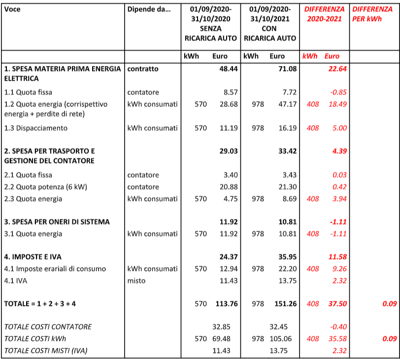 Quarto: faccia il confronto tra lug-ago 2021 e lo stesso set-ott 2020. O se volete tenere lo stesso periodo lug-ago 2021 con lug-ago 2020 (stessi oneri di sistema) anche se per me i confronti dovrebbero essere fatti tra periodi adiacenti con sufficienti differenze di consumi: il costo marginale dell’energia (che è quella da considerare per la carica delle nostre BEV) non dipende da chi è il responsabile del maggior consumo del periodo. Che sia l’auto o il condizionatore o la PdC non importa.