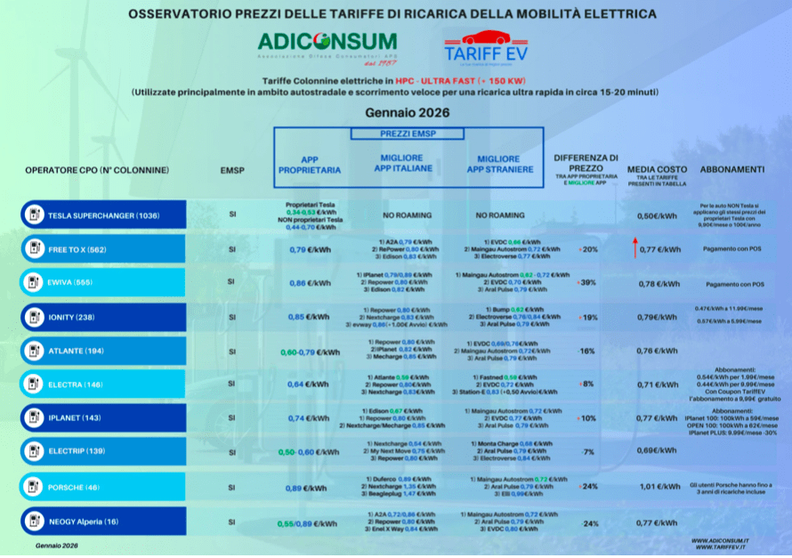 Risposta. Sul primo punto non vediamo problemi particolari, chiarendo a chi non lo sapesse che il frunk altri non è che lo spazio di carico anteriore delle auto. Sul secondo punto, invece, la risposta è molto più complicata. La ricerca della tariffa migliore richiede un continuo studio dei prezzi, via via aggiornati dalle varie app. La tabella qui sopra, tratta dal rilevamento mensile sulle tariffe di Adiconsum e TariffEV, è relativa alle ricariche da 150 kW e più. E dà un’idea di quante variabili da considerare ci siano, tra roaming e abbonamenti, nella caccia alla ricarica più conveniente. Già usufruire dei Supercharger con la tariffa dei proprietari di Tesla (0,34–0,53 a seconda di orari e stazioni) è comunque una buona base di partenza. Per il resto si tratta di capire quali sono le ricariche più convenienti sulle tratte che percorriamo abitualmente. E su quelle scegliere la app più conveniente. Tenendo presente che in molte stazioni ormai si paga anche con bancomat o carta di credito. Anche in autostrada, come annunciato pochi giorni fa da Free To X, presente su tutta la rete di Autostrade per l’Italia.