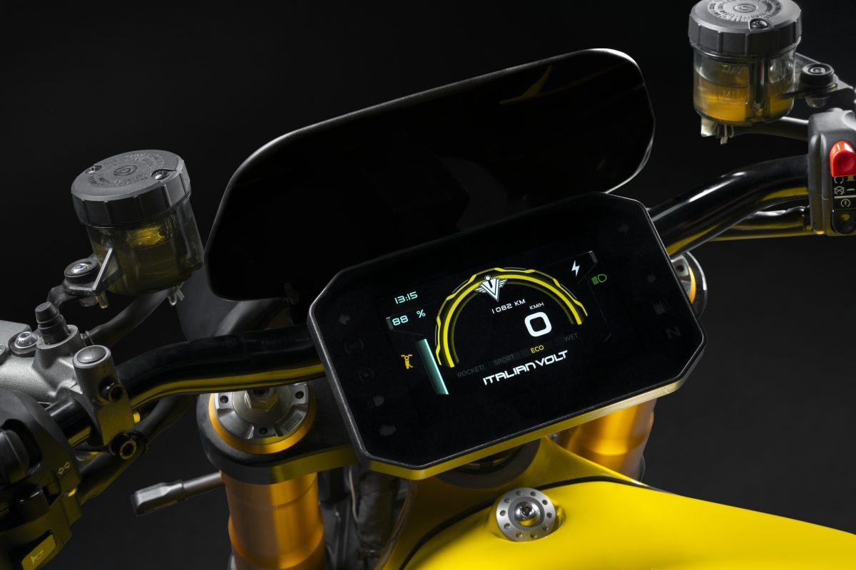 Di serie sfoggia un display digitale TFT da 5” protetto da un piccolo parabrezza blu.