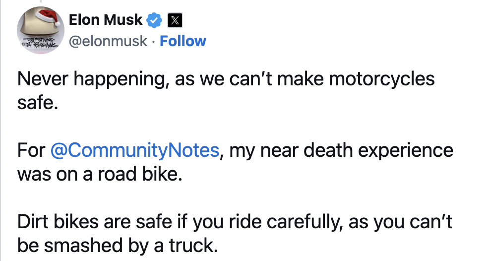Elon Musk ha commentato direttamente sul social network X (ex Twitter) stoppando ancora una volta ogni possibile speculazione: “Non succederà mai, non possiamo rendere sicure le moto”, ha scritto Musk, specificando che la sua visione è influenzata anche da una sua esperienza personale: da giovane ebbe un grave incidente in moto con un camion, che lo portò a riflettere sui rischi delle due ruote su strada.
