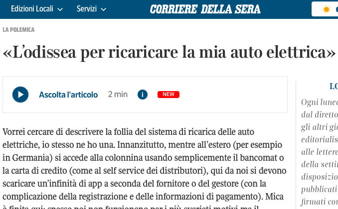 “Leggo sul Corriere nelle lettere ad Aldo Cazzullo, non nuovo a queste uscite “L’odissea per ricaricare la mia auto elettrica”. Apprezzo la vostra ‘missione’ nel fornire informazione e formazione verso un modello di mobilità più sostenibile ed economico. Avete la ‘santa’pazienza di trattare spesso questi casi. Vi giro dunque l’ennesima delirante esperienza (vera?) da parte di un insofferente automobilista alle prime armi con una Bev. Per gettare fango sulle stesse. Personalmente uso quotidianamente una Bev (una normalissima utilitaria) da 8 anni. Ho percorso 120 mila Km senza problemi particolari, anche per lunghi viaggi. Quello che manca in molti automobilisti insoddisfatti è il voler usare una Bev allo stesso modo di una Ice, con un atteggiamento mentale rigido. Anziché un approccio positivo, dati gli enormi benefici nell’usare una Bev: economici ambientali ect ect..”. Cesare Agnello