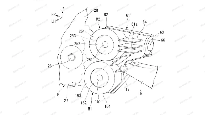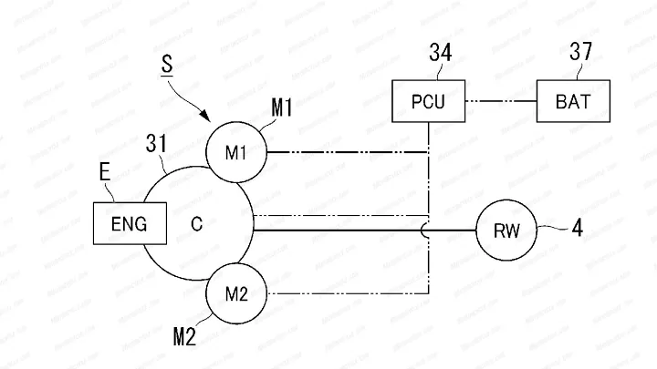 La PCU (Power Control Unit) gestisce la potenza erogata dal gruppo termico (ENG) e dai due motori elettrici (M1 e M2) che viene trasferita alla ruota posteriore (RW). In base alle situazioni i tre motori lavoreranno singolarmente a coppie o tutti insieme. L’obiettivo è la massima efficienza in ogni condizione. Infatti il vantaggio di avere due motori elettrici è quello di utilizzarne uno come propulsore e l’altro come generatore per ricaricare le batterie. I brevetti sembrano indicare una trasmissione con variatore, ma nulla esclude un’eventuale adozione del cambio.