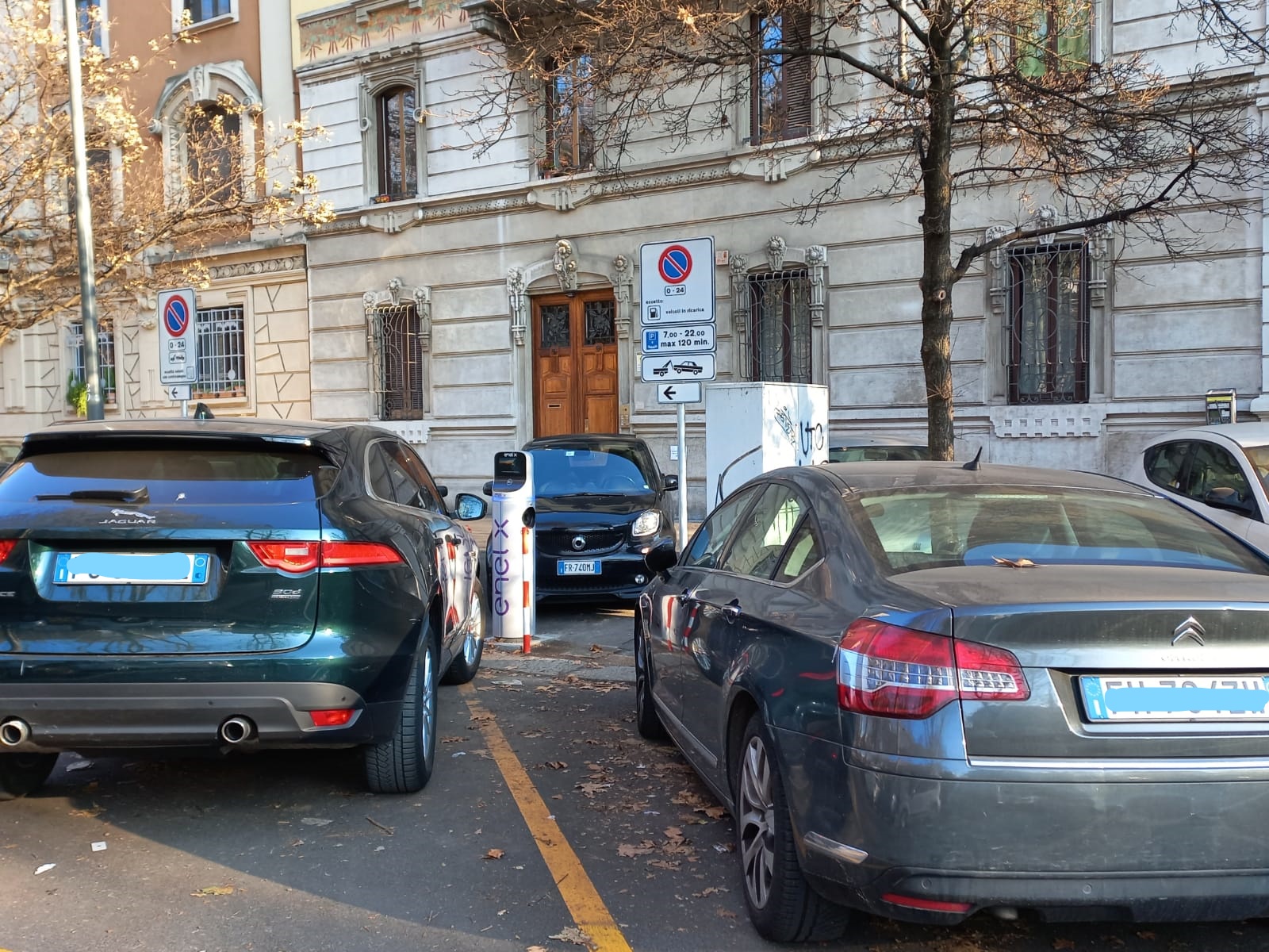 Altre due auto termiche (una Smart e una Renault), in sosta vietata sull’ampio marciapiede, precludono a un automobilista elettrico anche l’irrituale soluzione B per aver accesso alla colonnina. La stazione di ricarica risulta così assolutamente inaccessibile.