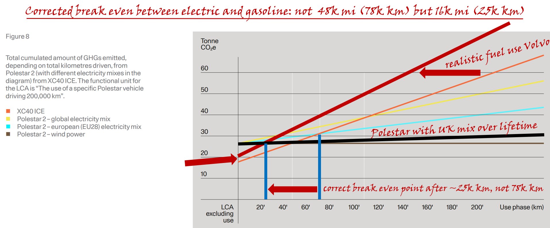La Volvo, in una sua ricerca ufficiale, dichiara 80000 km come punto di pareggio: tu dici 25000 perché parti dal presupposto che il consumo sia più alto, ma tutto dipende da chi guida l’auto, un hypermiler (come ce ne sono tra i redattori di questa rivista) potrebbe fare anche meglio. Tra l’altro utilizzando come metro di paragone l’auto a benzina più inquinante della gamma, che emette oltre 150 g di co2/km!: possiamo escludere bellamente che la media dei veicoli ICE oggi acquistati abbia quel tipo di emissioni o usi motori così datati, visto che ad esempio la BlueHDi 100 S&S Feel diesel con 102 cv parte da 86 g di co2/km, la Honda Civic 1.6 da 120 cv emette 90 g di co2/km, l’Opel Astra 1.6 diesel da 105 cv ne emette 90, la Skoda Superb 2000 diesel da 122 cv ne emette 90, la VW Gold 2000 diesel da 116 cv ne emette 90 [ fonte: https://www.quattroruote.it/news/burocrazia/2020/08/08/incentivi_auto_decreto_agosto/_jcr_content/content/article_attachment_136791739/file.res/Elenco-incentivi-CO2%2061-90.pdf ]