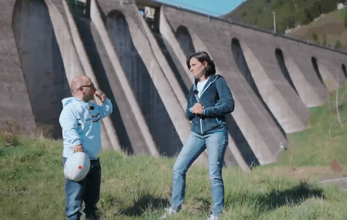 Matteo si trova all’interno di un’enorme batteria, “la più grande che abbia mai visto, 6 GWH!“ dice entusiasta. È in compagnia di Antonella Frigerio, vicedirettore del dipartimento sviluppo sostenibile e fonti energetiche di RSE; Paolo Valgoi, responsabile di opere idrauliche civili e di supporto impianti idroelettrici di A2A, ingegnere responsabile della sicurezza delle dighe e impianti Valtennina e Calabria. Ed Elisabetta Garti di A2A, che si occupa di impianti idroelettrici della Valtellina, di cui è responsabile. La diga di Val Grosina contiene circa 1.200.000 m³ di acqua. È strategica per la produzione idroelettrica A2A. Si inserisce nell’ambito negli impianti Idroelettrici Valtellina. Raccoglie le acque che ci sono a monte e che vengono accumulate a livello stagionale nei due grossi serbatoi di Cancano e di San Giacomo. Fa una regolazione giornaliera della produzione sulla centrale di Grosio.
