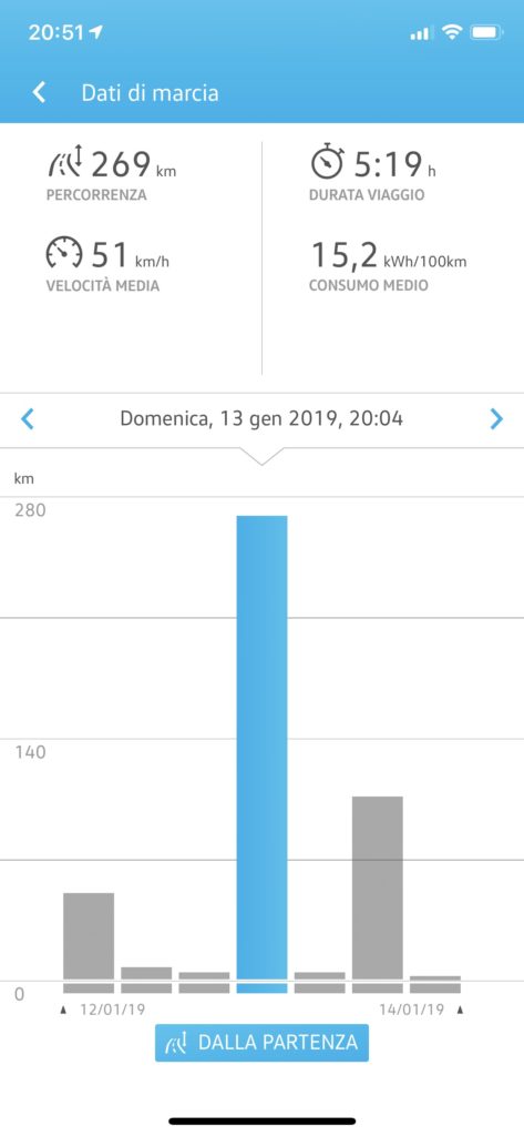 Una cena a Moena con partenza da Riva del Garda e ritorno: sono 269 km totali, di cui 62 in autostrada e la restante parte di strada di montagna, tempo di percorrenza di poco più di 5 ore. All’andata una temperatura vicina allo zero per i primi chilometri e di circa -6 nella seconda parte del percorso, con riscaldamento impostato a 23°. L’auto è dotata di pompa di calore, che consente di recuperare il poco calore prodotto dal motore elettrico e di utilizzarlo per climatizzare l’abitacolo. Forse le condizioni peggiori che ho incontrato fino ad ora. Partito con la batteria al 100% e l’auto preclimatizzata, ho raggiunto Moena con il 10% di batteria. Ho collegato l’auto alla colonnina di Dolomiti Energia in centro e sono andato a cena. Nelle tre ore e mezza della cena l’auto ha recuperato circa il 70 % della batteria, più che sufficienti per tornare a casa a fine serata, nonostante la temperatura fosse calata a -10 gradi in zona Moena e fino a Trento, e fosse di un paio di gradi sotto zero da Trento in poi. Velocità media 51 km/h, consumo medio 15,2 KWh/100km. Sopra a sinistra i dati di consuntivo del viaggio.