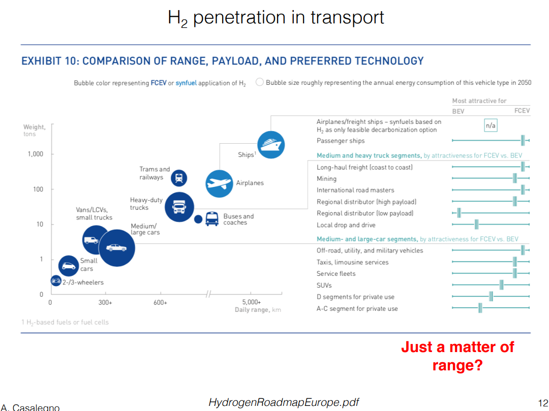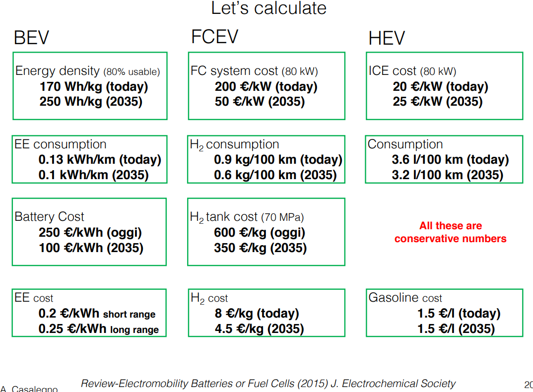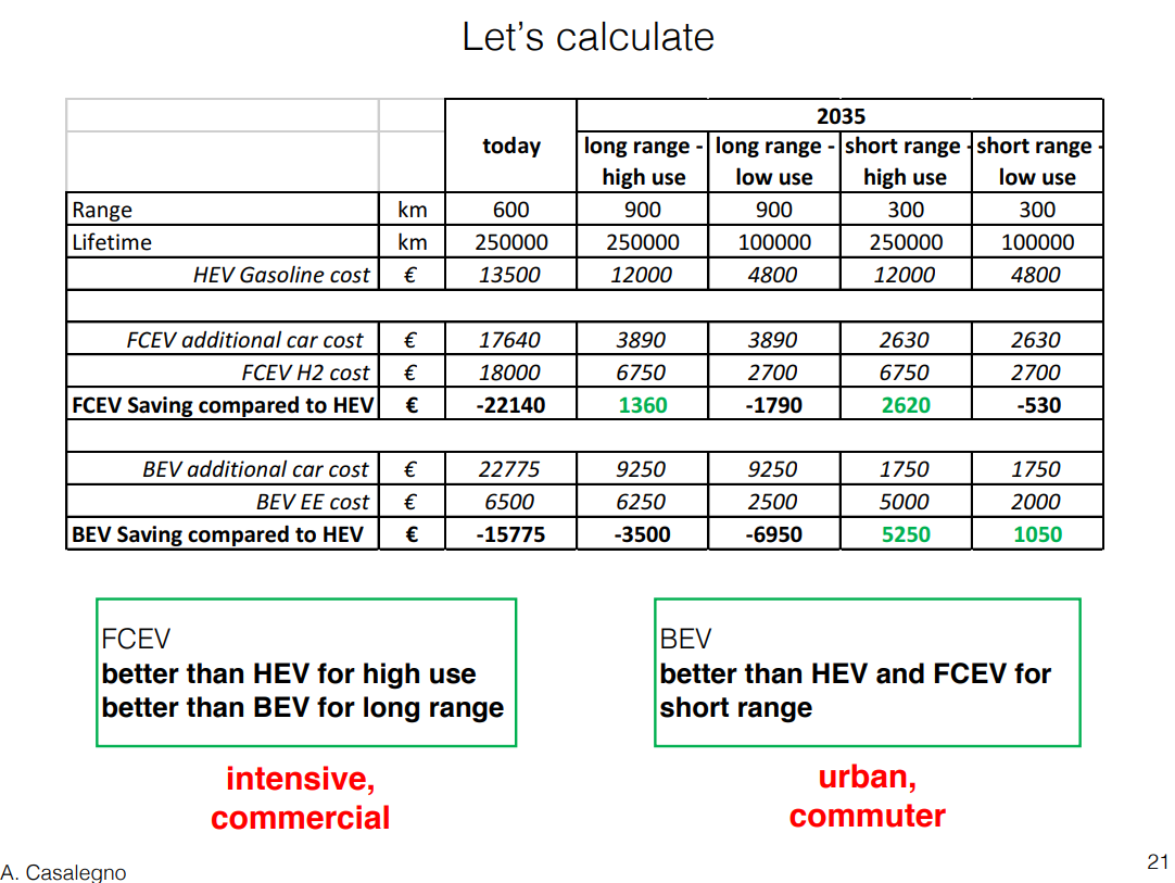 La scelta dipenderà esclusivamente da fattori economici. Sulla base di ipotesi circa la riduzione dei costi di queste tecnologie, sotto i trecento chilometri di autonomia la soluzione sarà sicuramente a batterie; oltre ci sarà spazio per soluzioni ibride. Poi, per grandi percorrenze ed elevata autonomia, e per i mezzi pesanti, le celle a combustibile. Diverse fonti ipotizzano una riduzione del costo delle batterie dagli attuali 200 euro a kWh a circa 100 euro a kWh. Noi siamo partiti da questo dato. Maggiore autonomia implica più batterie e più costo, e le batterie diventano quindi il costo preponderante. Mentre i sistemi a celle a combustibili si comportano un po’ come i motori termici, maggiore autonomia significa solo un serbatoio più grande.Certamente non sono serbatoi da poco, la standardizzazione europea più recente porta la pressione a 700 bar per i veicoli leggeri e a 350 bar per i serbatoi degli autobus. La comparazione economica tuttavia non va vista ai costi attuali, ma al costo prospettico.