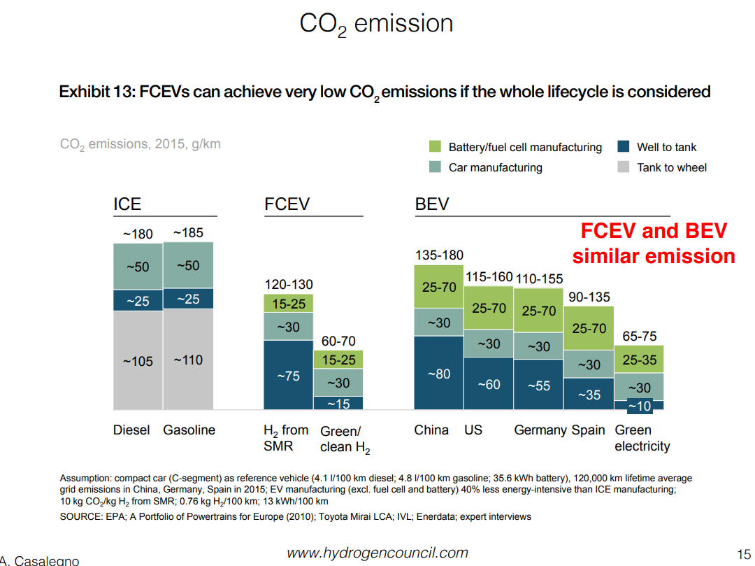 Dove in sintesi si conferma che l’ impronta CO2 dipende dal mix di fonti rinnovabili (e questo lo sapevamo giá), ma é interessante la conferma che giá oggi, con il mix attuale, largamente migliorabile, i veicoli elettrici, sia a batteria che ad idrogeno, lascino un’ impronta CO2 minore di quelli a combustione interna, ed entrando nello specifico, per uso automobilistico, i BEV(Battery electric vehicle) sono migliori dei FCEV (Fuel cell electric vehicle) cioé ad idrogeno :
