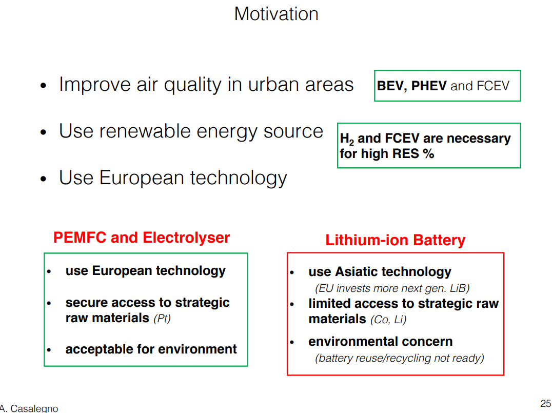 Non è solo una scelta ambientale o economica, ma soprattutto di indipendenza energetica, che è un fattore strategico; poi vi è anche un tema di leadership tecnologica. La tecnologia dell’idrogeno è stata sviluppata in Europa e l’Europa ne detiene tuttora la leadership. L’Europa vuole sostenere aziende europee, fare politica industriale. Inoltre trasformare il surplus produttivo elettrico in idrogeno lo rende disponibile per l’utilizzo anche nella mobilità ad idrogeno.