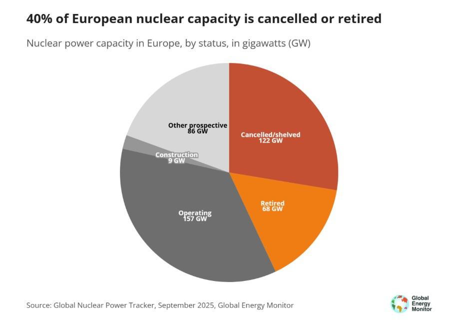 Secondo il nuovo briefing di Global Energy Tracker (qui il PDF del documento), infatti, il settore nucleare europeo ha perso 122 GW di capacità pianificata a causa della cancellazioni di nuovi progetti. Altri 68 GW sono stati ritirati e il 90% dei reattori rimanenti ha più di 35 anni.