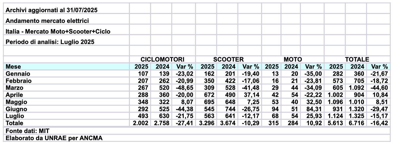A pesare è il calo in particolare dei ciclomotori. I cinquantini elettrici segnano a luglio quali un -22%. Gli scooter fermano le immatricolazioni a 563, lo scorso anno erano state 641 (-12%). Unico settore in crescita è quello delle moto elettriche con un +26%. Ma come al solito ricordiamo che i numeri sono talmente esigui (68 veicoli) da influire ancora poco sul totale.