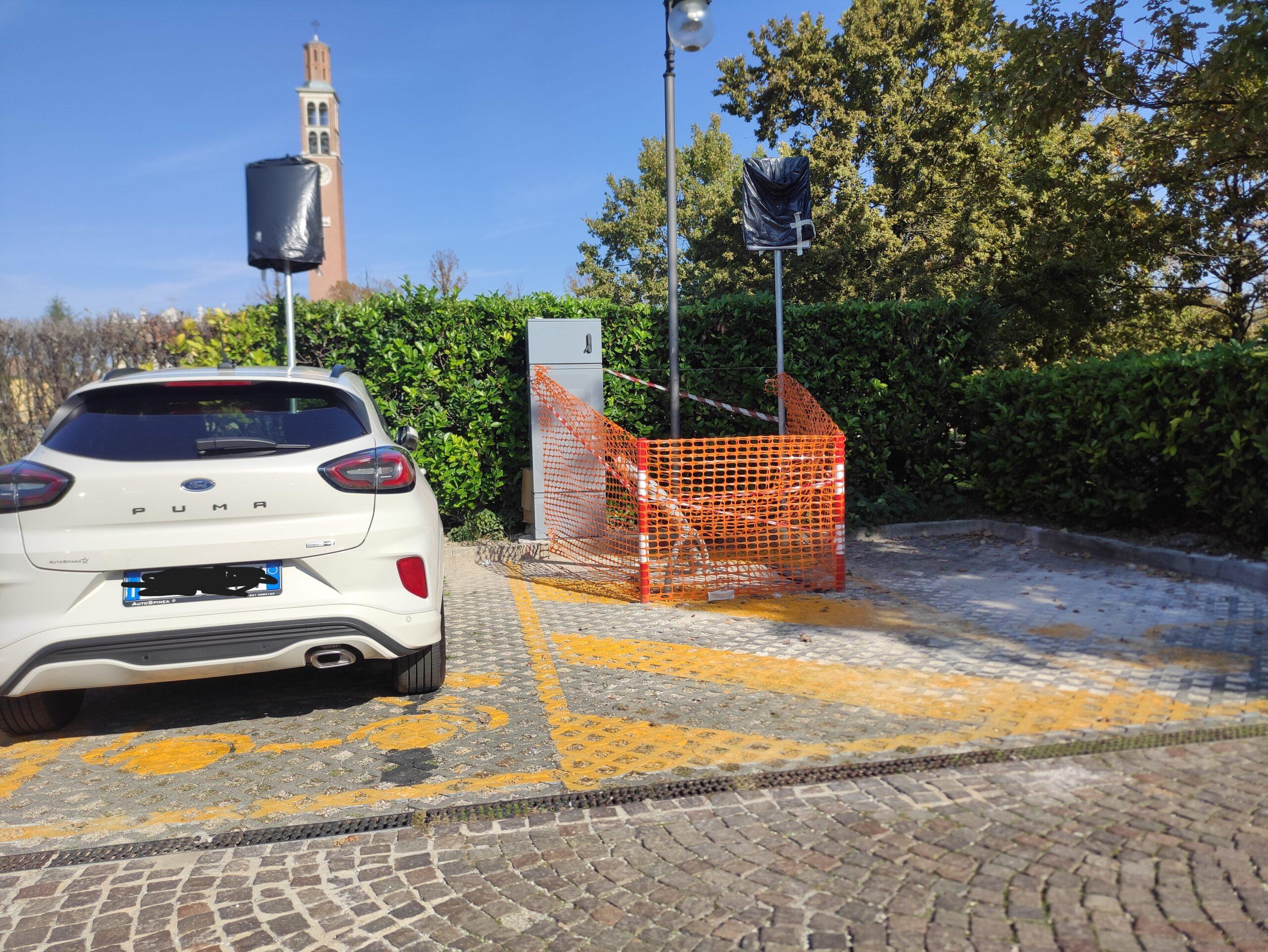11.10.2022. Ebbene, per tutta l’estate, quella colonnina non ha mai funzionato; a metà settembre vicino a questo primo punto di ricarica è riapparso un cantiere; questo di fatto non era neppure collegato alla rete elettrica.