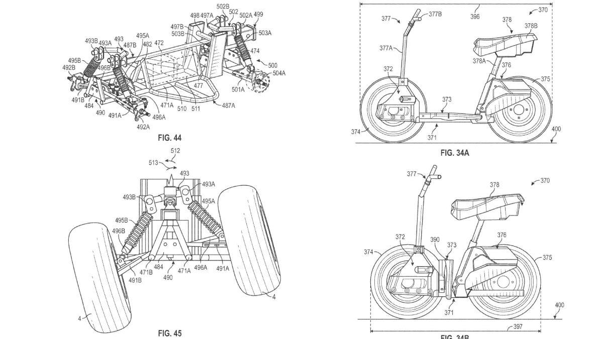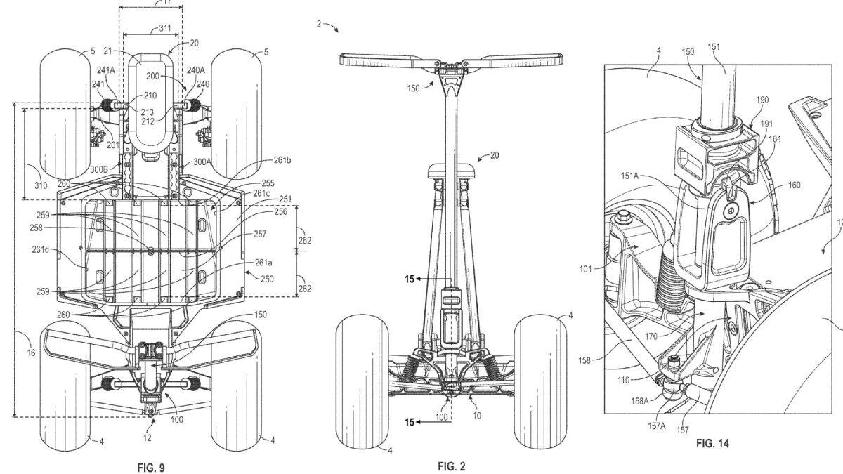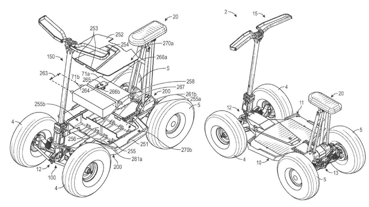 Ci ha preso gusto la statunitense Polaris che mette nero su bianco un monopattino elettrico a quattro ruote molto indicato per il fuoristrada, ma che ha grande potenziale anche nella vita di tutti i giorni. La disposizione di base è quella di un normale monopattino largo con una pedana, un aggancio per aggiungere un sedile e il piantone del manubrio. Ma è nel sostegno delle ruote che si trovano le idee più interessanti.