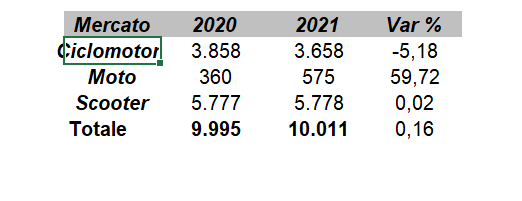 Forse anche perchè il grosso dei modelli a batteria si concentra per ora nel settore dei ciclomotori (velocità massima 45 km/h) che è quello meno tonico in generale. Anche fra le termiche, infatti, i ciclomotori, con 17.675 veicoli venduti, segnano una flessione del 3,1% sul 2020. Gli scoote di cilindrata maggiore sono invece cresciuti del 21,6%) e le moto del +28,1%.