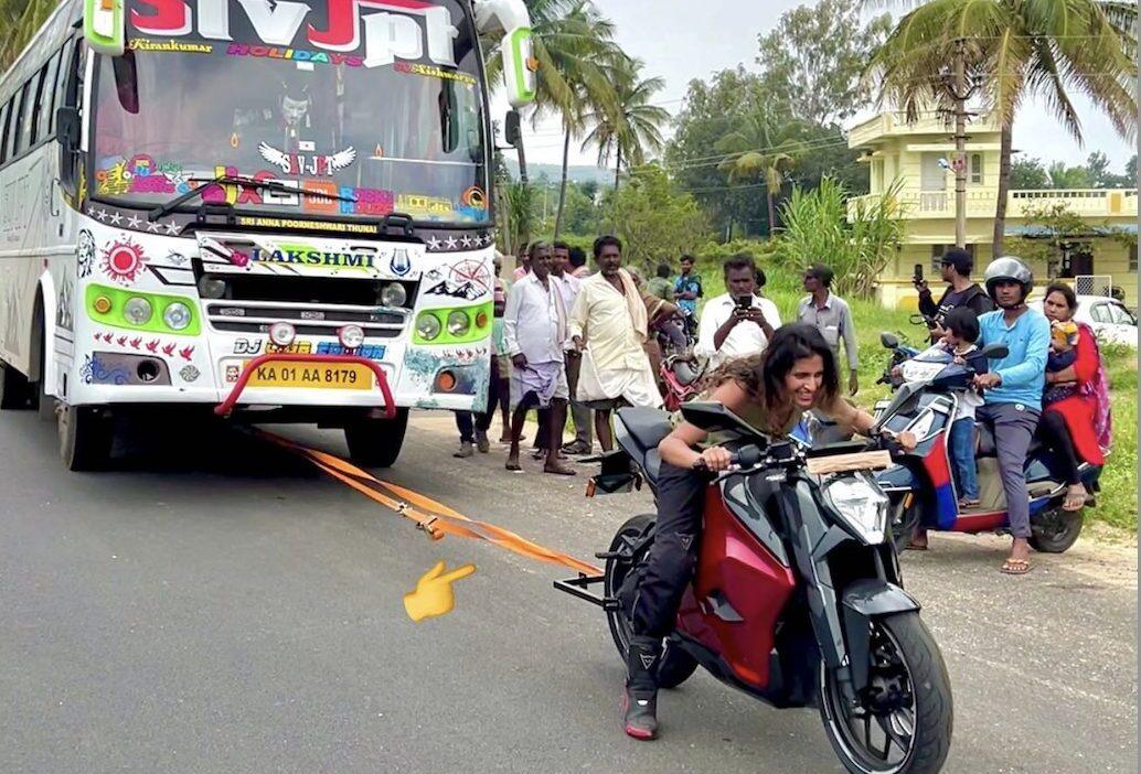 La prova si è svolta per step. Forte dei suoi 29 kW di potenza e 100 Nm di coppia massima, la moto indiana è riuscita prima a trainare senza problemi un minivan Toyota, poi un grosso camion portacontainer (6,5 tonnellate), con tanto di conducente a bordo, e infine, pure un autobus da 50 posti di circa 7.5 tonnellate!