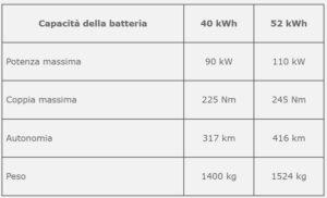 La potenza di ricarica in CC è di 100 kW per la batteria da 52 kWh e 80 kW per la batteria da 40 kWh. I tempi di ricarica da dal 15% all’80% sono di 30 minuti. Entrambe le batterie sono dotate di pompa di calore e di una funzione di riscaldamento e raffreddamento, per aumentare l’efficienza di ricarica.