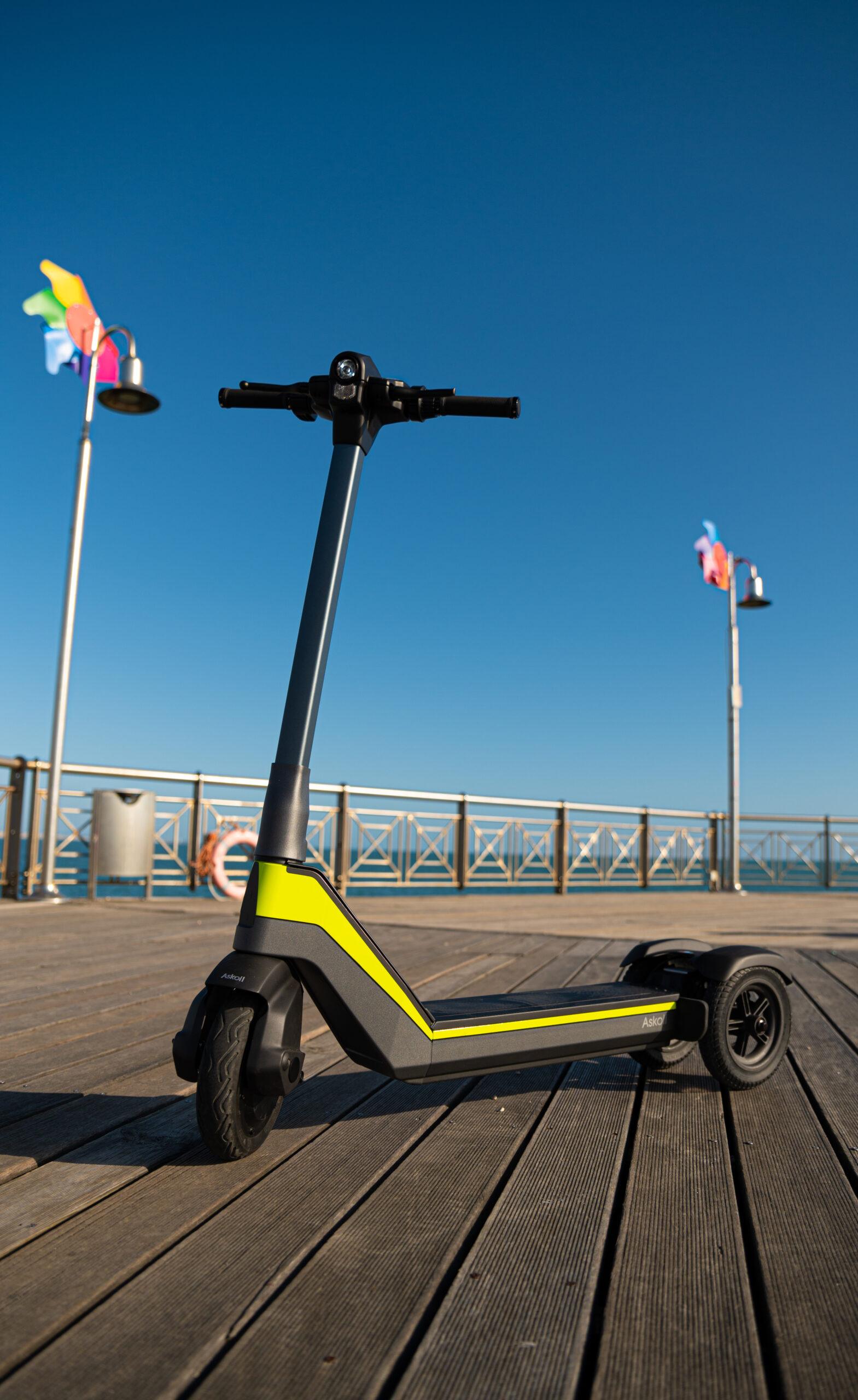 Tre ruote antiforatura con raggio da 10”, doppio freno a disco sul posteriore, ammortizzazione presente sia sulla forcella che sul retrotreno e pedana basculante che da una parte offre un’esperienza di guida simile ai monopattini attuali e dall’altra consente un handling ottimale. Un prodoto che si affianca ad un motore elettrico brushless da 350 W con coppia di 25 Nm posizionato nella ruota anteriore. Batteria agli ioni di litio da 630 Wh (3,8 kg di peso) e autonomia fino a 60 km. La velocità massima è di 25 km/h e il monopattino, come accade già sugli scooter Askoll, ha la possibilità di poter essere utilizzato in tre modalità di erogazione di potenza più una quarta destinata alle zone pedonali che limita la velocità a 6 km/h. La struttura è in alluminio e consente un carico massimo di 110 Kg.