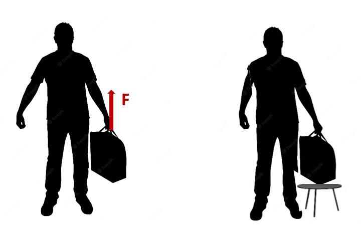 Ad esempio, se tenete ferma una valigia in mano avvertirete una certa fatica perché il corpo deve tenere in tensione i muscoli (non siamo stati progettati dalla natura per stare fermi in mezzo alla savana tenendo una valigia in mano). Tant’è che qualcuno, che ha pena nel vedervi in quello stato, potrebbe benissimo portarvi un tavolino della stessa altezza della base della valigia dove appoggiare la valigia: fine della fatica, fine della forza del vostro braccio e la valigia è rimasta lì dove era prima. Zero lavoro e zero energia in gioco.