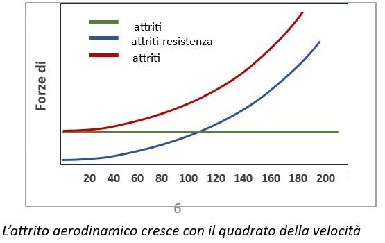 Tuttavia anche l’attrito aerodinamico non cresce più perché non cresce più la velocità, quindi il risultato è una condizione di equilibrio dove la velocità si stabilizza ad un limite, la velocità massima. Tutto ciò vale sia che abbiamo il piede a tavoletta sia tenendolo premuto in modo parziale. In questo secondo caso questo l’equilibrio si raggiungerà ad una velocità inferiore perché la forza che spinge è minore.