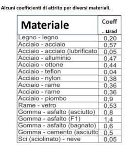 - il coefficiente di attrito μ (si pronuncia “mu”) dipende esclusivamente dalle caratteristiche dei due materiali a contatto, (alla fine dell’articolo pubblichiamo una tabella con i valori di alcuni casi significativi): più il valore è alto e maggiore sarà la forza di attrito (vedi tabella in fondo alla fine dell’articolo con i valori di alcune superfici)