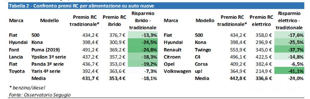 Tornando al costo delle polizze RCA per le auto elettriche, Segugio.it fornisce anche qualche indicazione di raffronto su modelli specifici. E sottolinea che per alcuni modelli il risparmio raggiunge valori ben più alti della media. Volkswagen up! per esempio, registra un risparmio del 41,1% e Renault Twingo del 37,7%. Anche per le ibride il costo medio delle polizze si differenziano molto da modello a modello: il massimo si raggiunge con Ford Puma (-24,8%) e Hyundai Kona (-24,5%), mentre per Toyota Yaris 4a Serie, una delle ibride più diffuse, il risparmio risulta al di sotto del 10%.