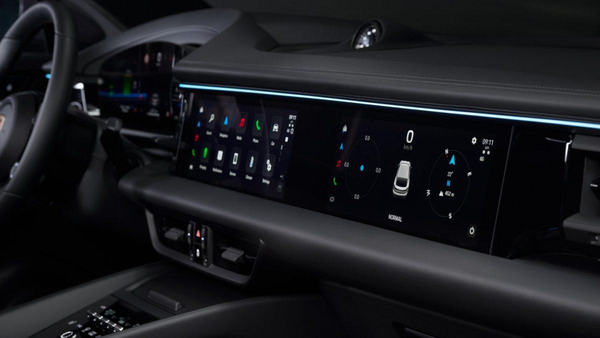 L’impressione è che Porsche abbia voluto rendere l’abitacolo avvolgente come quello di una macchina sportiva. E, allo stesso tempo, grazie alle vetrature dare anche una sensazione di grande ariosità. Domina una plancia dallo sviluppo orizzonatale con tre display. A sinistra quello da10,9 pollici dedicato al passeggero, identico nell’hardware a quello centrale che governa gli apparati multimediali e i setting dell’auto. Il sistema operativo utilizza la nuova generazione di Android Automotive. Di fronte al guidatore invece c’è uno schermo curvilineo da 12,6 pollici dove troviamo tutte le informazioni di guida. Non bastassero questi tre, la Porsche Macan è dotata anche dell’head-up display con tecnologia di Realtà Aumentata.