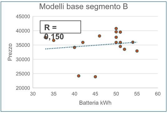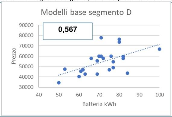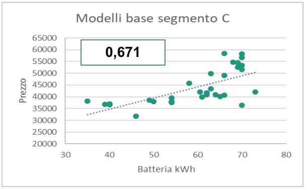 La guerra commerciale vera, per ora, si combatte sui segmenti più alti, e propriamente nei C e D, dove infatti abbiamo una correlazione significativa tra batteria e prezzo, a conferma che qua le cose hanno preso una forma logica, pur rimanendo a livelli superiori di prezzo rispetto alle analoghe termiche.