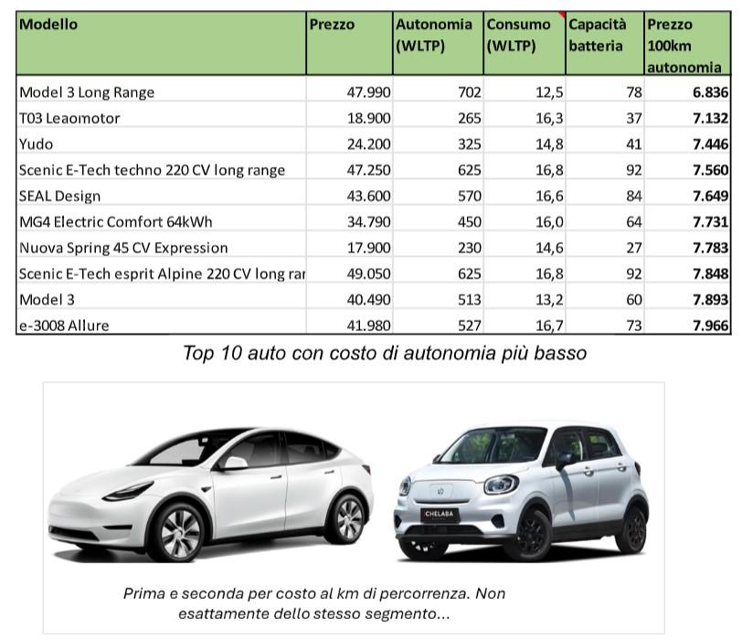 ci aggiungerei anche una tabellina dei modelli con minor costo euro x kwh possibile nei vari segmenti (cosi a occhio: T03, e-C3, Yudo, MG4, Tesla, Scenic ?) sempre per confronto con i listini tra un anno