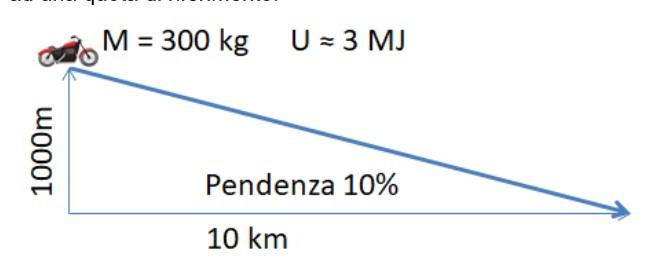 Assumiamo di trovarci con la moto (massa con il pilota 300 kg) a 1000 m di altezza rispetto ad una quota di riferimento.