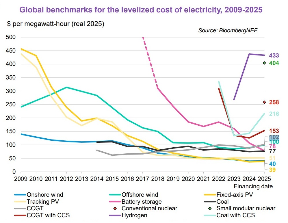 Nel 2025, sono crollati ulteriormente i costi dei sistemi di accumulo. Al contrario, dopo anni si è invertita la tendenza per fotovoltaico e solare. e i costi delle tecnologie chiave per la transizione energetica hanno mostrato segnali contrastanti. È quanto emerge dal rapporto “Levelized Cost of Electricity 2026” di BloombergNEF, che analizza l’andamento del “costo livellato” dell’energia a livello globale. Con Lcoe si intende l’indicatore che misura quanto costa produrre un megawattora (MWh) di elettricità con una determinata tecnologia lungo l’intero ciclo di vita dell’impianto.