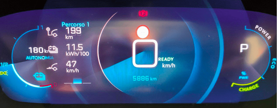 Per il tipo di utilizzo del veicolo che viene effettuato in famiglia, l’autonomia rimane sufficiente: nominalmente, su ciclo WLTP, l’autonomia dichiarata è di 340 Km, quindi una percorrenza tipica di 270-290 Km, guidando con attenzione, può essere accettabile (senza riscaldatore inserito).