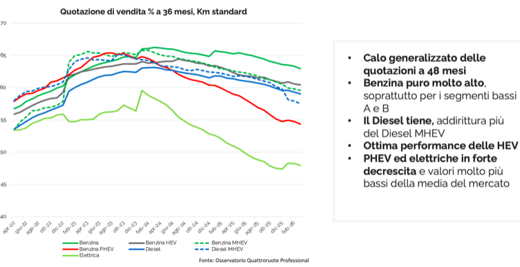 La Fiat 500e, ha perso il 49% del prezzo originale, mentre la versione a combustione ha ceduto solo il 27,1%. Ma le elettriche registrano perdite significative anche tra i SUV compatti premium. La Mercedes-Benz EQA ha bruciato oltre il 52% del prezzo originario, a fronte del 30,2% della GLA. Una tendenza simile si riscontra in tutti i segmenti e i marchi. La Peugeot e-208 registra un calo del 50,1%, la Hyundai Kona Electric del 43,4%. In entrambi una perdita superiore di quasi 18 punti % rispetto alle versioni convenzionali. L’unica eccezione in questo confronto è la Porsche Taycan, che ha perso il 47,2% del valore, mentre l’equivalente a combustione, la Panamera, ha subito un calo del 48,5%. La svalutazione più rapida delle elettriche è confermata anche da Quattroruote Professional, con i le tendenze sintetizzate nel grafico qui sopra. Nell’usato tiene ancora il diesel, in caduta libera nel nuovo. E tengono molto bene le ibride. Mentre elettriche e plug-in hanno i valori residui più bassi.