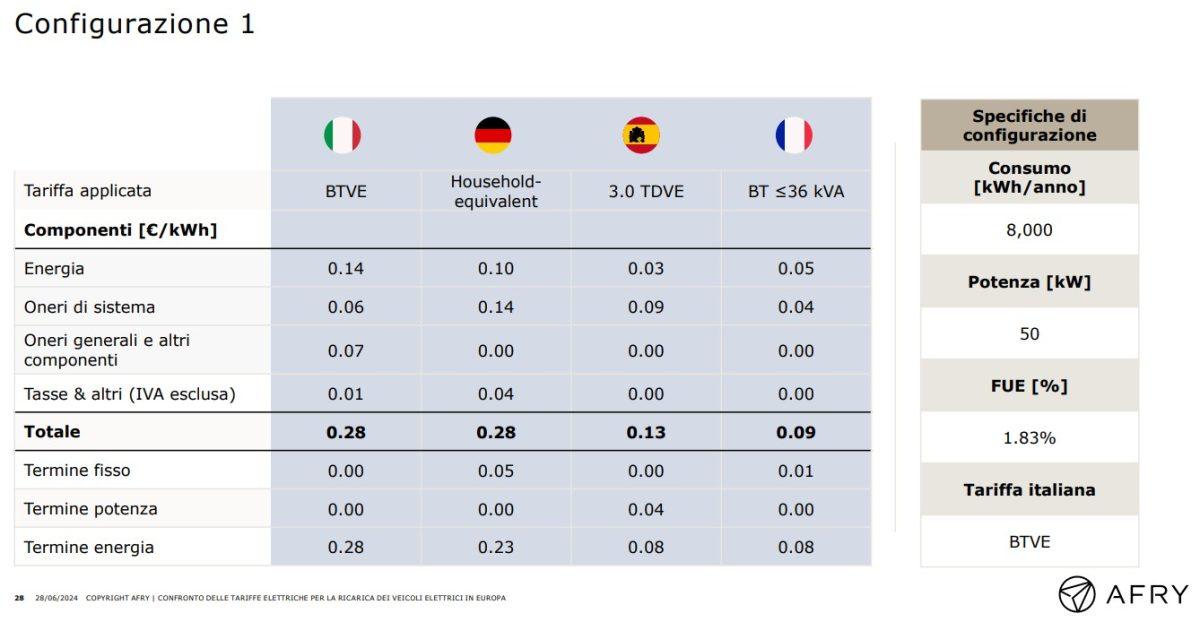 Ma vediamole nel dettaglio, grazie ai numeri dello studio AFRY Management Consulting per Motus-E realizzato allo scopo di confrontare i costi base degli operatori della ricarica in Italia, Germania, Spagna e Francia.