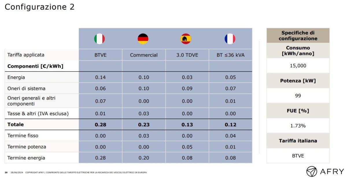 Per le colonnine a bassa tensione Quick e Fast fino 99 kW tutti e quattro i Paesi esaminati impongono una tariffa di approvvigionamento elettrico che tiene conto del prezzo dell’energia nazionale più oneri fissi.