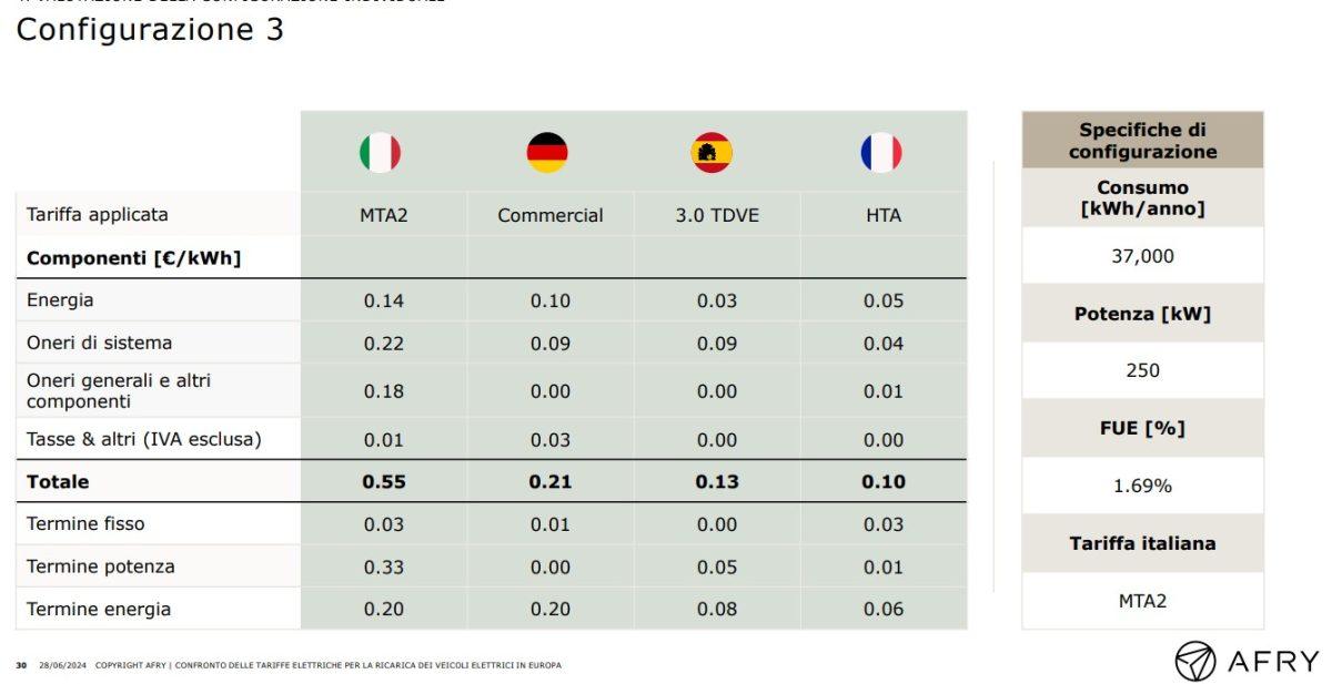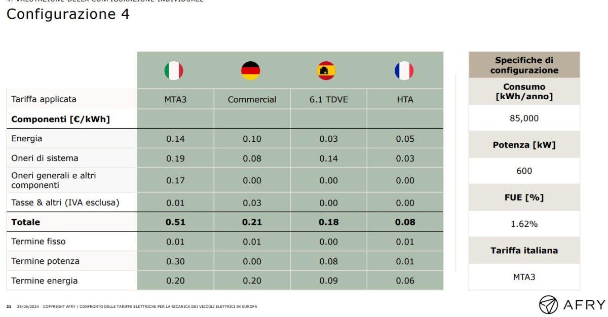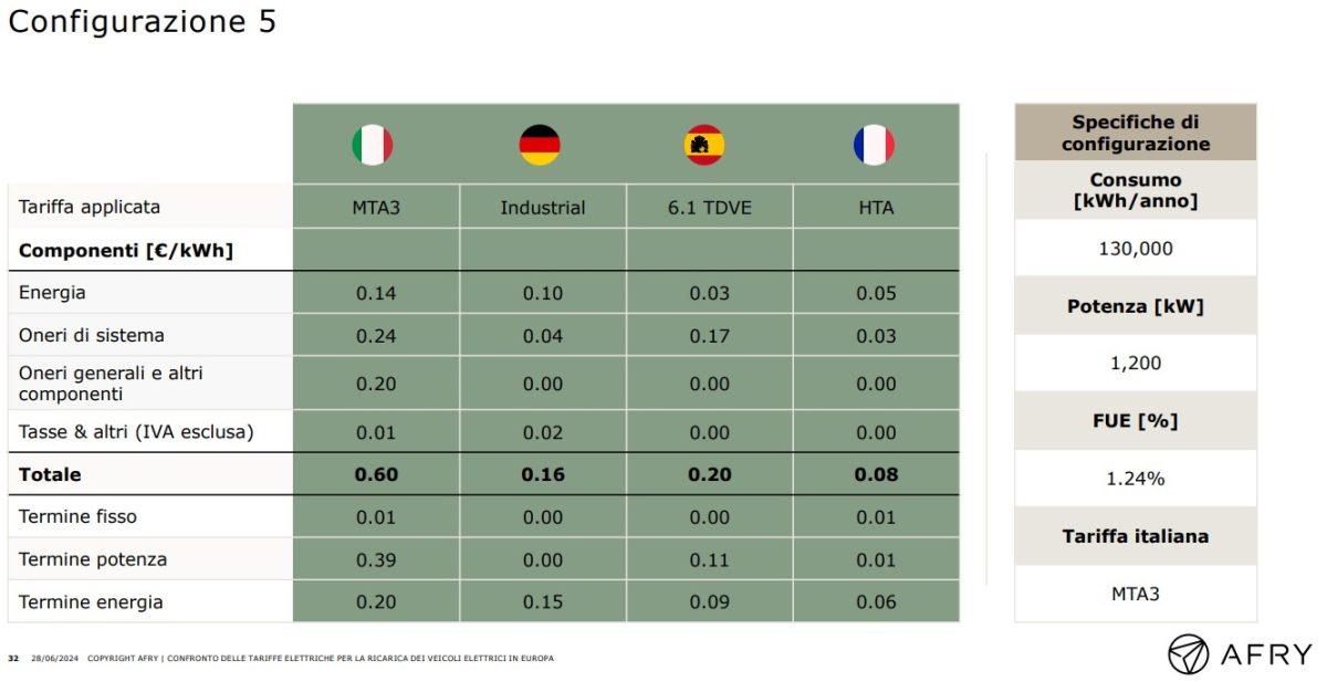 Aggiungiamo che qui si impennano anche gli investimenti in infrastruttura, con colonnine e installazioni che possono costare da 50 a 500 mila euro a singola stazione di ricarica. Infatti il divario fra i costi tariffari italiani e quelli spagnoli, tedeschi e francesi si amplia ulteriormente, come si vede dalle relative tabelle.
