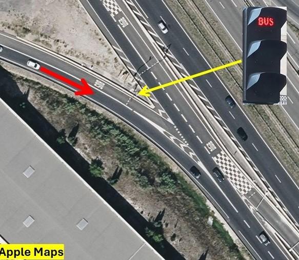Utilizzando Google Maps e Street View, ho ricostruito il punto esatto in cui si è verificato l’errore. Si tratta di un innesto su una superstrada senza pedaggio, dove è presente una corsia riservata agli autobus, regolata da un semaforo dedicato.