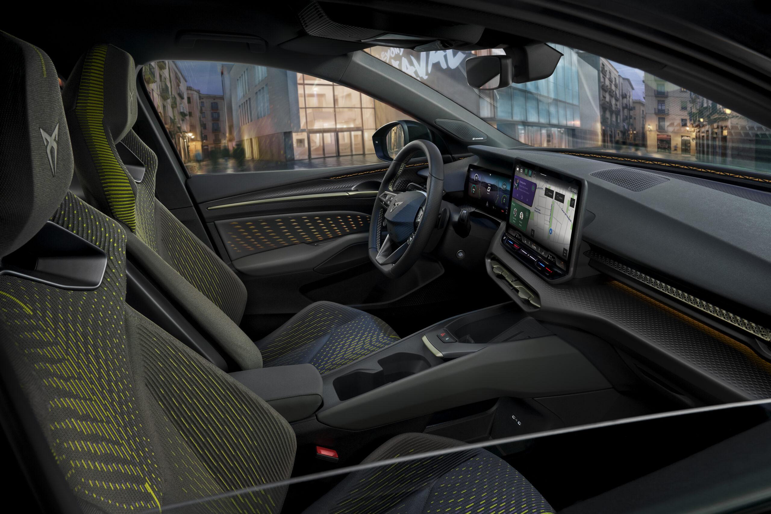 Nel laterale emerge con più evidenza l’ispirazione al casco da corsa, elemento che ha guidato le proporzioni della Raval. La linea è tesa, dinamica e inclinata verso il posteriore, dove torna la firma luminosa Cupra accompagnata da uno spoiler superiore che contribuisce sia all’estetica sia all’aerodinamica. Il bagagliaio offre una capacità di 430 litri, valore significativo per il segmento.