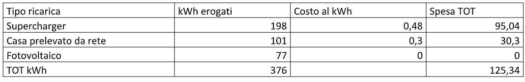A completamento dei dati con il mix di costi energetici e i consumi rilevati (17,8 kWh/100km al prezzo medio di 0,39 € al kWh) si ottiene una spesa di circa 7 € ogni 100 km percorsi. Potete confrontare con le vostre spese e le altre motorizzazioni.