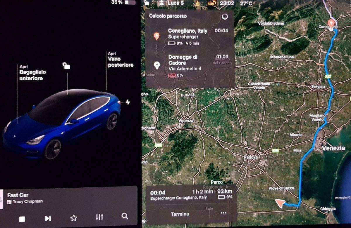 Quando sono partito senza preavviso con batteria al 35% ho dovuto fare una sosta in andata e anche una al ritorno lungo la strada ai supercharger di Mogliano Veneto e di Conegliano, aumentando i tempi di viaggio di 35 minuti in andata e altrettanti al ritorno, non è poco e va considerato.