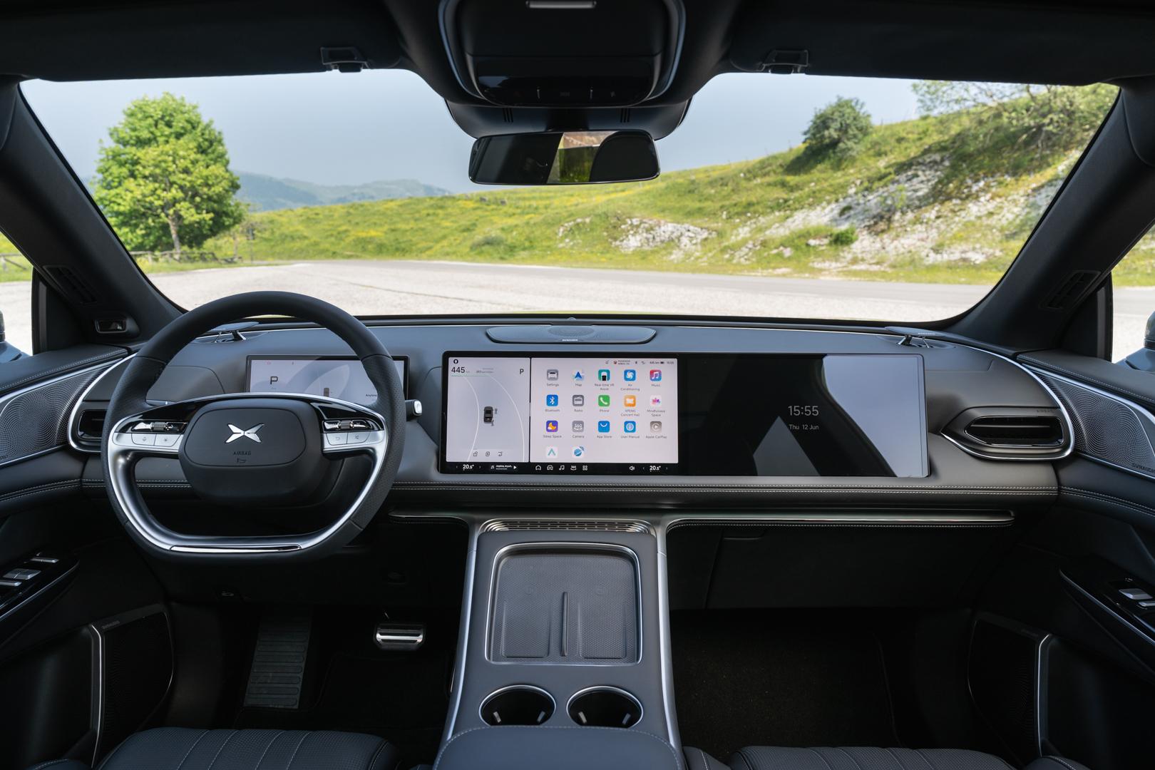 Gli interni sono molto sobri eleganti e, al contrario dell’esterno, qui le linee sono tutte parallele e gli angoli tutti a novanta gradi. Nulla da dire sulla qualità costruttiva e sulla scelta dei materiali: c’è tanta pelle, tante superfici morbide e anche le plastiche sono di buona qualità. Molto comodi e ben fatti anche i sedili che sono riscaldabili e raffrescati. Rispetto allo standard si ha l’impressione che siano più larghi del normale. In plancia domina un display da 15”, vero cervello della Xpeng G6. Da qui si comanda tutto attraverso una serie ampia e profonda di menù. Il software è però molto intuitivo e semplice da usare. Comoda la tendina che contiene una serie di shortcut per le funzioni che si utilizzano più di frequente.Davanti al conducente c’è uno schermo da 10 pollici troviamo tutte le solite informazioni di guida.
