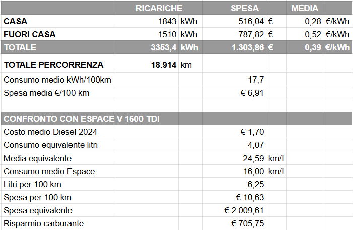 Nonostante la mole della macchina il consumo si è assestato in 17,7 kWh/100 km. Al prezzo medio di 0,39€ al kW mi ha permesso di risparmiare oltre 700€ di carburante rispetto alla mia vecchia Espace. Tanto? Poco? Ognuno farà le proprie considerazioni. Per me questo risultato è la ciliegina sulla torta.