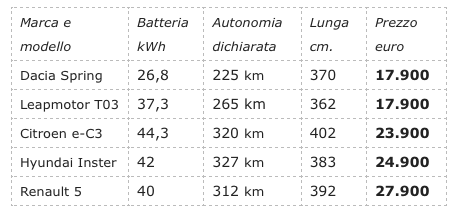 Risposta. Finalmente comincia a esserci una buona scelta di piccole elettriche, anche di dimensioni inferiori rispetto alla Zoe (peraltro ormai fuori produzione). Nella tabella a fianco abbiamo riassunto lo stato dell’arte, con le caratteristiche di 5 modelli che rientrano in un range di prezzo che va da 17.900 a 27.900 euro. Le due meno costose, la Dacia Spring e la Leapmotor T03, sono made in Cina, anche se vendute da gruppi europei come Stellantis e Renault. L’autonomia non arriva a 300 km e si tratta quindi di auto da città o poco più. E anche la potenza è limitata, soprattutto nella Spring, che non va oltre i 45 Cv (la T03 ne ha 95). Gli altri tre modelli, presentati in tabella nelle versioni meno costose e con autonomia più contenuta, si prestano a un uso un po’ più esteso, anche grazie a buone potenze di ricarica Quindi a soste più brevi. La Inster, in particolare, arriva a 120 kW, la e-C3 a 100 e la Renault 5 a 80. La Citroen e la Hyundai hanno forme da piccoli Suv, mentre la R5 si richiama a un’icona del secolo scorso: bisogna capire la mamma di Matteo che gusti ha…Naturalmente non va dimenticata la 500e, che però costicchia ed è in attesa di una nuova versione (più economica) che dovrebbe arrivare a breve.