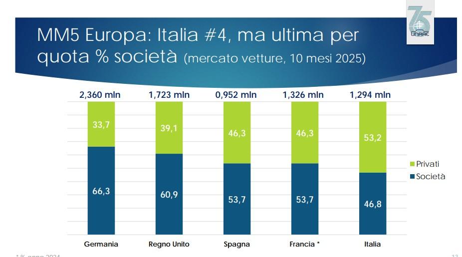 Dunque pesano di più altri gap strutturali. In primis la bassa penetrazione delle auto aziendali. A causa di un trattamento fiscale penalizzante, infatti, in Italia le auto aziendali hanno la penetrazione più bassa fra i 5 Major Market: 46,8% vs il 66,3% della Germania. Un segmento che, con il veloce tasso di rotazione delle flotte, è in grado di immettere sul mercato vetture più recenti e tecnologicamente avanzate.