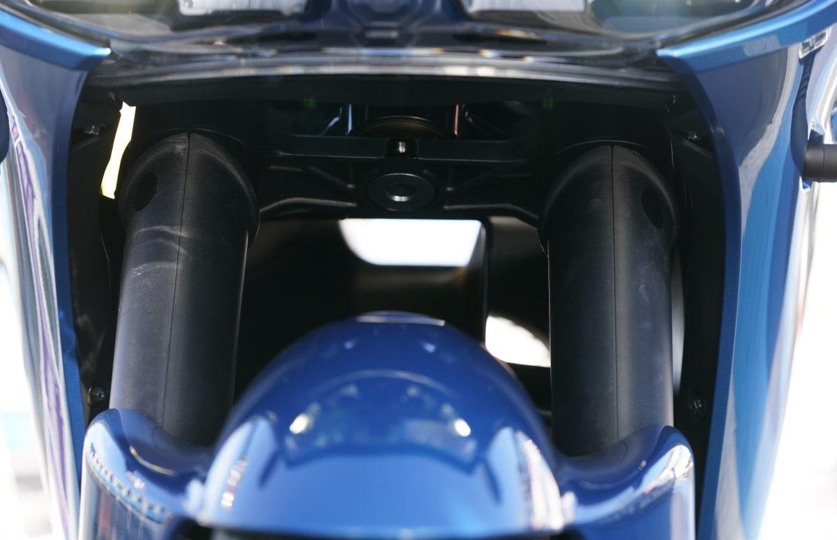 Oggi White Motorcycle Concept sta lavorando insieme a Zero Motorcycle per implementare i loro studi e la loro tecnologia proprio sulle moto californiane. Il progetto si chiama WMCSRS, WMC come White Motorcycle Concept e SRS dal nome del modello Zero su cui si sta sperimentando. Il principio applicato è lo stesso della WMC250EV, ma meno estremizzato. Ad un primo sguardo infatti la Zero Motorcycle non sembra così diversa dal modello che troviamo in concessionaria. C’è però una bocchetta sopra la ruota anteriore che consente l’ingresso dell’aria nel condotto che sbuca dal posteriore, sotto al telaio reggi sella. Il condotto ha le dimensioni di circa 15 cm e attraversa longitudinalmente tutta la moto passando sopra al pacco batteria. Per ricavare lo spazio necessario l’elettronica è stata spostata in alto sacrificando il vano porta oggetti. Anche la setta è stata leggermente rialzata.